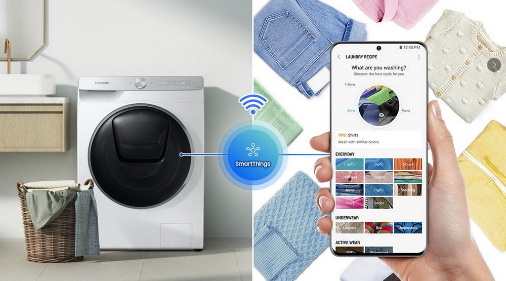 • Điều khiển mọi lúc, mọi nơi qua ứng dụng SmartThings: Máy giặt Samsung AI hỗ trợ Internet of Things (IoT), có thể kết nối với các thiết bị thông minh như smartphone, Smart TV, tủ lạnh Family Hub, các sản phẩm gia dụng khác cũng như các ứng dụng thông minh như Alexa và Google Home. Ứng dụng SmartThings không chỉ có thể điều khiển máy giặt mọi lúc, mọi nơi (miễn là có kết nối Internet), mà còn đề xuất chế độ giặt theo loại vải và quản lý thời gian giặt giũ theo mong muốn.