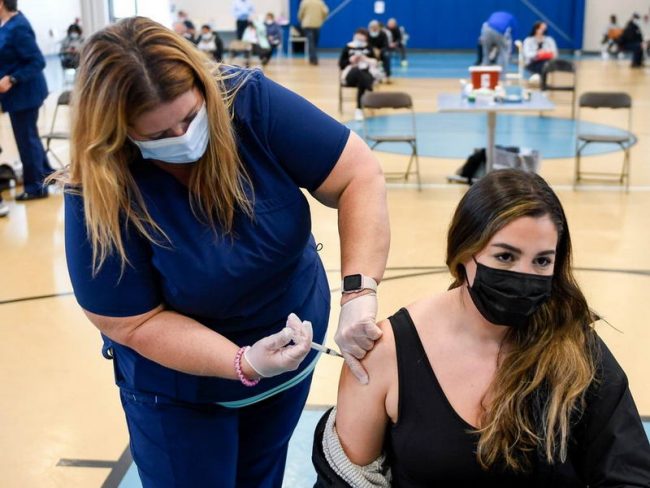 Nữ y tá Elizabeth Johnson đang tiêm COVID-19 vaccine cho chị Melissa Mendez tại Reading (bang Pennsylvania). Nguồn ảnh: Ben Hasty/MediaNews Group/Reading Eagle/Getty Images