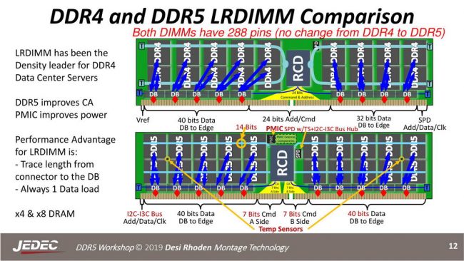 Theo đặc tả đã được JEDEC phê duyệt, DDR5 cũng có 288 chân (pin) như DDR4, nhưng số chân data bus tăng từ 72 pin lên 80 pin. Dung lượng một con chip DRAM có thể lên tới 64GB và một thanh DDR5 có thể đạt dung lượng tới 2TB. DDR5 tiết kiệm năng lượng hơn DDR4 khi giảm điện áp (voltage) từ 1,2V (DDR4) xuống 1,1V.