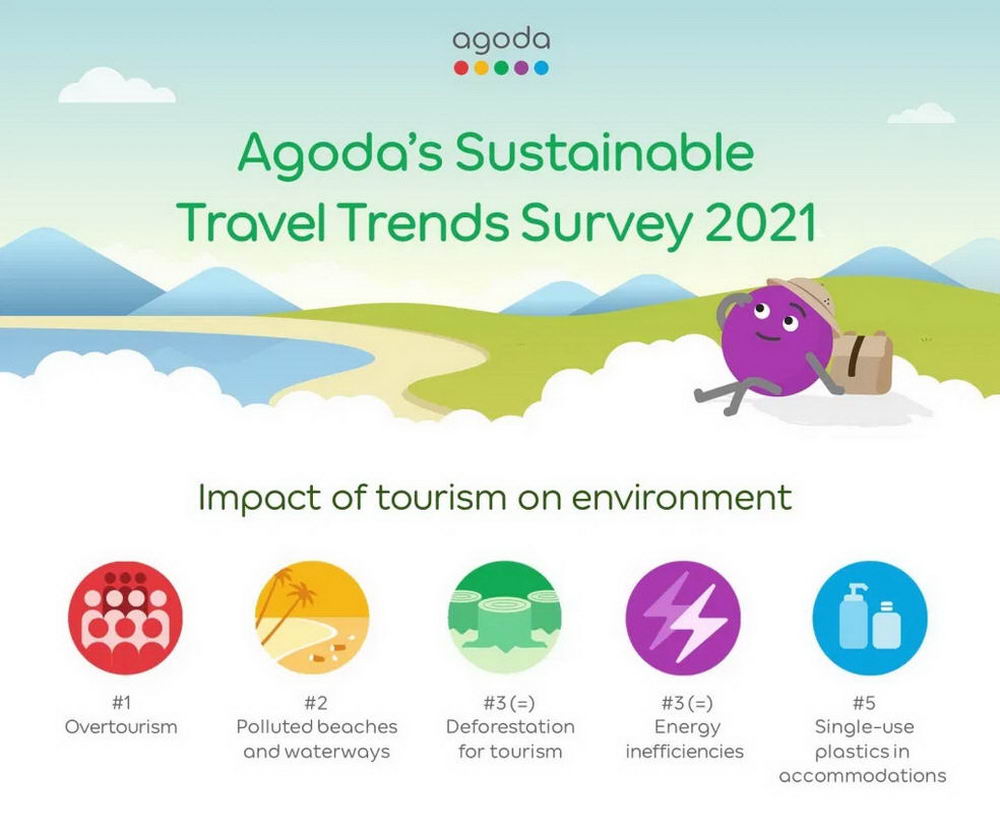 Khảo sát được Agoda công bố nhân Ngày Môi trường thế giới (World Environment Day) 5-6-2021 cũng phần nào tiết lộ tình trạng quá tải khách du lịch trên toàn thế giới và ô nhiễm biển và nguồn nước là hai vấn đề quan ngại hàng đàu làm ảnh hưởng đến du lịch hiện nay. Theo sau là vấn nạn phá rừng làm du lịch và sử dụng năng lượng không hiệu quả (bao gồm tiêu thụ điện/nước quá mức cần thiết) cùng đồng hạng 3.