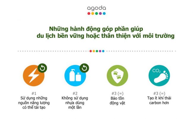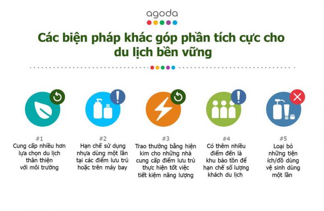 Khảo sát Xu hướng Du lịch Bền vững (Sustainable Travel Trends Survey) do Agoda thực hiện mới đây chỉ ra 3 giải pháp hàng đầu giúp du lịch phát triển bền vững bao gồm: cung cấp nhiều hơn những lựa chọn du lịch thân thiện với môi trường, hạn chế đồ nhựa dùng một lần và có hình thức trao thưởng bằng hiện kim cho những nhà cung cấp điểm lưu trú thực hiện tốt các biện pháp tiết kiệm năng lượng. Bên cạnh đó, việc có thêm nhiều khu bảo tồn (protected areas) nhằm hạn chế lượng khách du lịch và loại bỏ các sản phẩm phòng tắm dùng một lần cũng là những phương pháp hữu ích trong bảng xếp hạng những giải pháp tích cực góp phần giúp du lịch thêm bền vững.