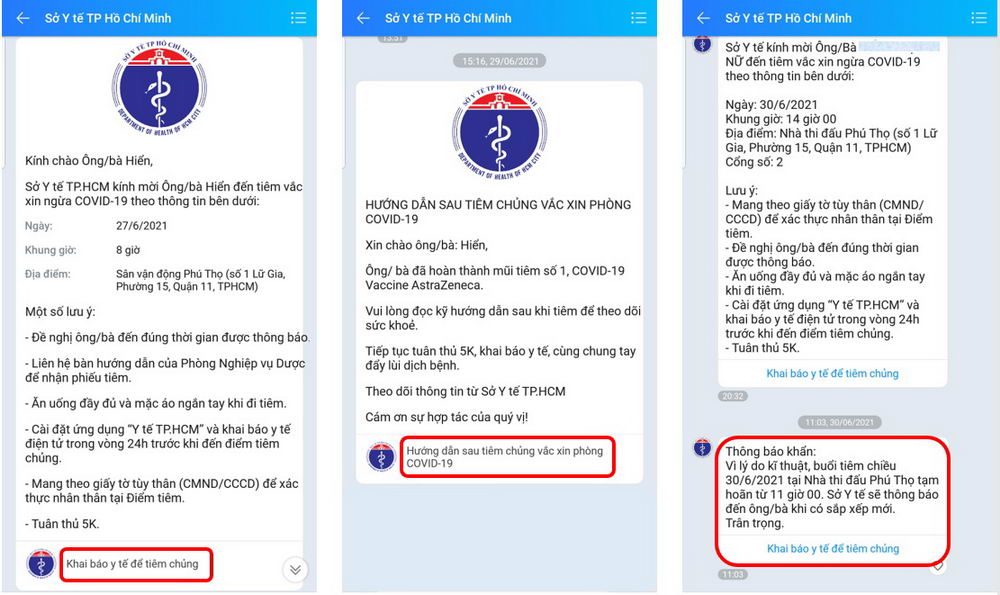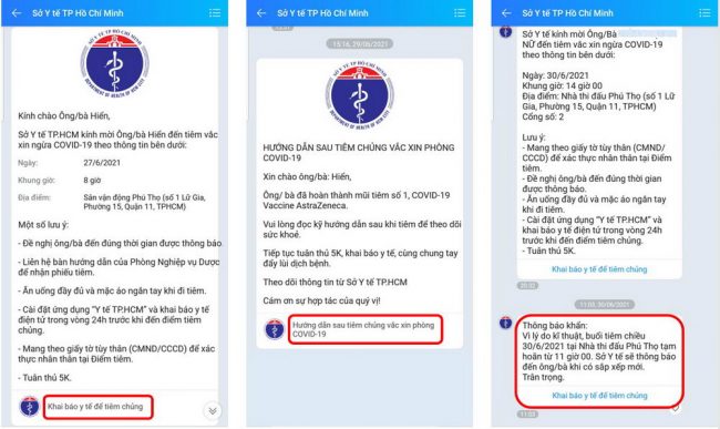Chị Minh Hiển (Quận Gò Vấp, TP.HCM) cho biết: “Sáng ngày 27-6 mình nhận được tin nhắn từ Zalo của Sở Y tế TP.HCM thông báo về việc đi tiêm vaccine. Nội dung rất cụ thể, rõ ràng về điạ điểm, ngày giờ, mình chỉ cần làm theo hướng dẫn thôi.”