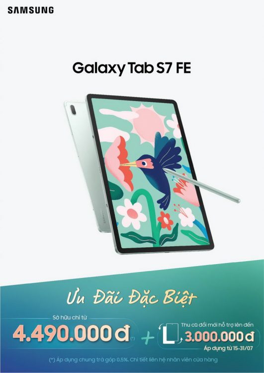 Tại Việt Nam, Galaxy Tab S7 FE được bán ra với mức giá 13,99 triệu đồng với hai màu pastel là Xanh Mint Thời Thượng và Đen Phong Cách, mang đậm dấu ấn cá nhân. Đặc biệt, nhân dịp ra mắt Tab S7 FE tại Việt Nam, Samsung cũng đưa ra hai chương trình ưu đãi lớn dành tặng các khách hàng đặt mua sản phẩm sớm. Theo đó, kể từ ngày 15-7 đến ngày 31-7-2021, người dùng chỉ cần trả trước 4,49 triệu đồng khi tham gia mua trả góp với mức phí ưu đãi 0,5% cùng chương trình trợ giá đặc biệt mùa giãn cách hỗ trợ đến 3 triệu đồng vào các ngày từ 16 đến 19-7 và từ ngày 23 đến 26-7.