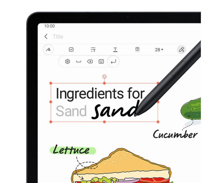 Trên Tab S7 FE, bút S Pen được thiết kế đính lên thân máy bằng nam châm tiện lợi và không cần sạc. Bút S Pen đã được cải tiến với độ trễ thấp và đầu bút mềm mại mang lại trải nghiệm thao tác tự nhiên, nhất là khi kết hợp cùng ứng dụng ghi chú Samsung Note với nhiều tính năng cải tiến như chuyển chữ viết tay thành văn bản theo thời gian thực, sắp xếp ghi chú khoa học hơn dựa theo gợi ý tiêu đề và hashtag, cho phép bạn tìm kiếm ghi chú chính xác ngay lập tức, dù nhập liệu bằng viết tay hay văn bản dựa trên bàn phím. Galaxy Tab S7 FE cũng được cài đặt sẵn một loạt ứng dụng hỗ trợ bút S pen về thiết kế và sáng tạo như Noteshelf, PENUP, Clip Studio Paint, Canva Pro…, cho phép bạn thỏa sức sáng tạo với các đường nét đầy cảm hứng và không giới hạn bằng bút S Pen.