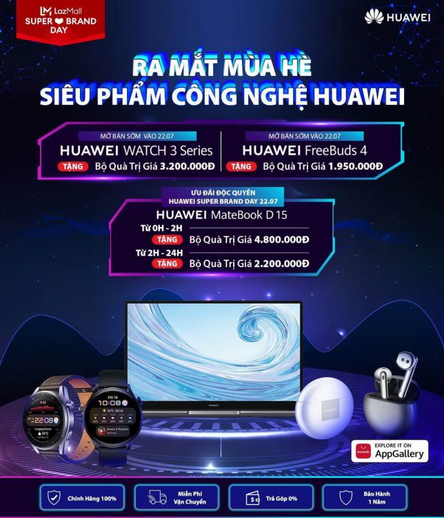Tập đoàn công nghệ Huawei tiếp tục hợp tác với Lazada – nền tảng thương mại điện từ hàng đầu Đông Nam Á – trong sự kiện mua sắm “Ngày Siêu thương hiệu” (Super Brand Day) diễn ra vào ngày 22-7-2021. Nổi bật của sự kiện lần này là Huawei mở bán độc quyền máy tính xách tay HUAWEI Matebook D 15 trên sàn Lazada Việt Nam với giá siêu ưu đãi chỉ 12.990.000 đồng kèm những quà tặng khuyến mại trị giá nhiều triệu đồng.