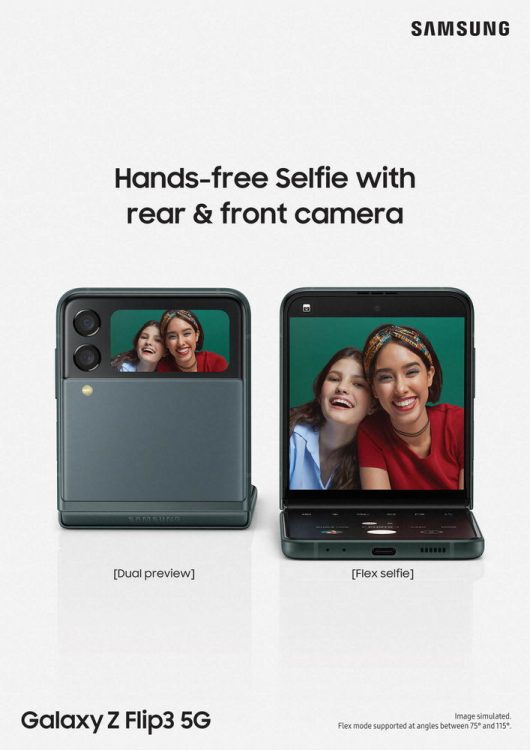 Z Flip3 cũng được thiết kế để mang đến cho người dùng khả năng chụp và chia sẻ kỷ niệm đáng nhớ một cách độc đáo hơn. Tích hợp các tính năng chụp ảnh mới nhất, người dùng có thể chụp ảnh không chạm (hands free) để tạo ra những bức ảnh selfie độc đáo hơn với chế độ Flex. Hoặc họ có thể giữ cho thiết bị gập lại và chụp ảnh nhanh, thậm chí là quay video ngay từ màn hình ngoài thông qua tính năng Quick Shot bằng cách nhấn đúp vào phím nguồn của Z Flip3. Ngoài ra, việc xem và chia sẻ nội dung cũng siêu mượt mà nhờ tốc độ làm mới màn hình linh động 120Hz của Z Flip3.