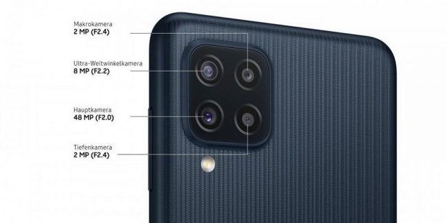 Galaxy M22 có cụm quad-camera với camera chính 48MP, camera siêu góc rộng 8MP, camera xóa phông 2MP khẩu độ f2.4 đo chiều sâu, và camera macro cận cảnh 2MP với cự ly 3-5cm.