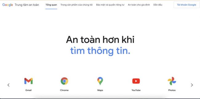 Trung tâm An toàn Google chia sẻ các thông tin an toàn bảo mật và riêng tư của nhóm sản phẩm đa dạng của Google, từ Gmail, Google Meet, Google Tìm kiếm, trình duyệt Chrome, bản đồ Maps, đến YouTube và Android, tổng hợp cách Google thực hiện để giữ thông tin cá nhân người dùng riêng tư và an toàn, đồng thời cung cấp cho họ quyền kiểm soát. Bên cạnh đó, trang chia sẻ các mẹo bảo mật hữu ích từ cơ bản đến nâng cao giữ an toàn cho người dùng bất cứ khi nào họ trực tuyến, không chỉ trên các sản phẩm của Google.