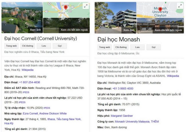 Ngoài ra, bất cứ khi nào bạn muốn kiểm tra lại các thông tin cơ bản về trường như học phí, điểm đầu vào, các chứng chỉ cần thiết, Bảng Tri thức của Google sẽ giúp bạn cập nhật và tổng hợp những thông tin đó nhanh chóng.