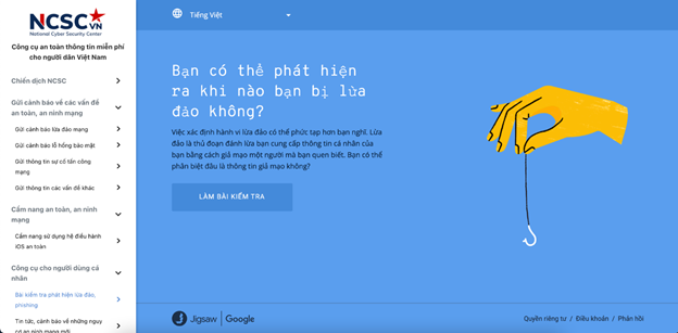 Công cụ Trắc nghiệm về Lừa đảo qua mạng do Google phối hợp cùng Trung tâm NCSC Việt Nam xây dựng.