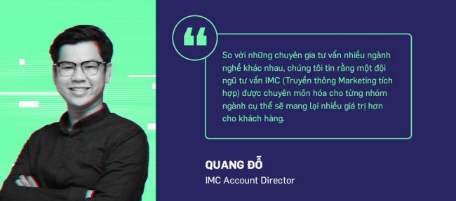 Ông Quang Đỗ, IMC Account Director, tại văn phòng Vero Việt Nam, cho biết. “Trước xu hướng tích hợp hóa dịch vụ trong các agency, chúng ta có thể thấy các thương hiệu ngày nay thường được tư vấn bởi đội ngũ tư vấn bao quát nhiều lĩnh vực (generalist). Tuy nhiên để hỗ trợ khách hàng tốt hơn, chúng tôi tin rằng họ cần có cơ hội để tích luỹ kiến thức và kinh nghiệm chuyên sâu trên từng lĩnh vực cụ thể mà mình đang tư vấn bên cạnh việc tích hợp hóa dịch vụ. Nói cách khác, so với những chuyên gia tư vấn nhiều ngành nghề khác nhau, chúng tôi tin rằng một đội ngũ tư vấn IMC (Integrated Marketing Communications, truyền thông tiếp thị tích hợp) được chuyên môn hóa cho từng nhóm ngành cụ thể sẽ mang lại nhiều giá trị hơn cho khách hàng.”