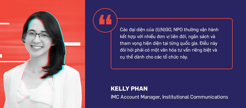 Bà Kelly Phan chia sẻ: “Các đại diện của (I)(N)GO, NPO (tổ chức liên chính phủ, tổ chức phi chính phủ, hay tổ chức phi lợi nhuận) thường có hướng tiếp cận khác biệt khi triển khai các hoạt động truyền thông và thương hiệu cho tổ chức của mình. Họ thường vận hành kết hợp với nhiều đơn vị liên đới, ngân sách và tham vọng hiện diện tại từng quốc gia. Điều này đòi hỏi phải có một văn hóa tư vấn riêng biệt và cụ thể dành cho các tổ chức này. Với đội ngũ tư vấn cho các tổ chức chuyên biệt, chúng tôi tự tin có thể giải quyết các vấn đề đặc thù của nhóm ngành này và phục vụ mạng lưới (I)(N)GO và NPO rộng lớn hơn tại Việt Nam với phương pháp truyền thông tích hợp.”