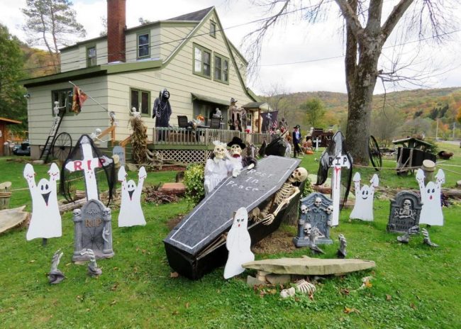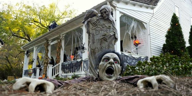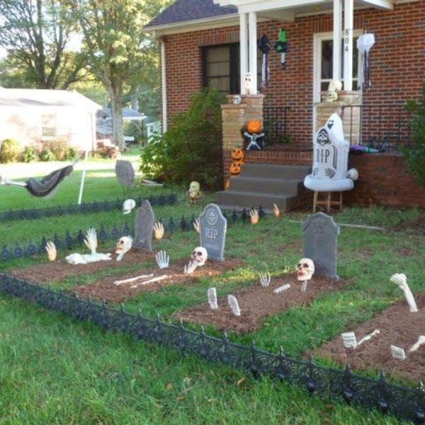 Đây là một lối “chơi” Halloween tiêu biểu ở Mỹ. Chủ nhà biến sân cỏ trước nhà thành bãi tha ma. Bên những tấm mộ bia xiêu vẹo là những bộ xương khô, ngồi vắt chân chữ ngũ, vẫy tay chào khách qua đường. Vài tên zombies trong tư thế đang chui ra từ những chiếc quan tài mục nát. Chủ nhà còn dùng những thiết bị điện tử như đèn màu chập chờn, tiếng hú lạnh gáy của quái thú và giọng cười nổi da gà của ma quỉ… để gây ấn tượng.