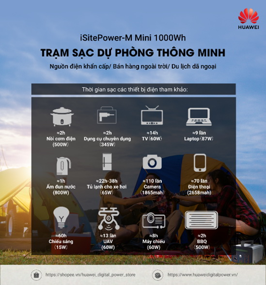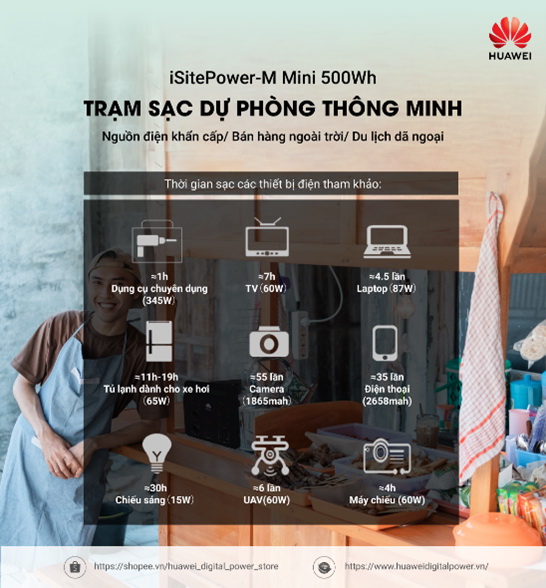 Huawei Digital Power Việt Nam ngày 22-11-2021 đã ra mắt trạm sạc dự phòng di động thông minh HUAWEI iSitePower-M với công suất 500Wh và 1000Wh, thích hợp cho những người làm việc lưu động hay dã ngoại.