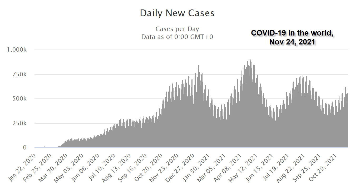 Từ lưu ý của một người bạn, A Phủ nhìn lên biểu đồ COVID-19 của Worldometer update lúc chiều tối 24-11-2021 thì thấy thế giới đang trong thời kỳ leo dốc của một đợt bùng phát mới, cho mùa Đông COVID-19 thứ 2. Rồi xem thử biểu đồ của trang này về tình hình COVID-19 tại Việt Nam thì thấy cũng tương tụ. Trong đợt bùng phát thứ 4, cao điểm là ngày 26-8-20221 với 16.491 ca nhiễm mới, sau đó giảm dần xuống tới thấp nhất là ngày 12-10 với 3.024 ca mới. Nhưng sau đó lại túc tắc tăng dần, từ ngày 16-11 đã bắt đầu vượt mốc 10.000 ca, và tới chiều tối 24-11 là 11.811 ca nhiễm mới (trong đó có 22 ca nhập cảnh).