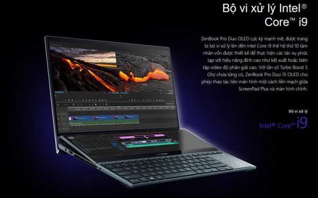 Zenbook Pro Duo 15 OLED thực sự là một cỗ máy với hiệu năng mạnh mẽ. Máy được trang bị bộ vi xử lý lên đến Intel Core i9 thế hệ 11 có 8 nhân 16 luồng với bộ nhớ DDR4 dung lượng 32GB, bộ nhớ lưu trữ 1TB SSD PCIe và card đồ họa NVIDIA GeForce RTX 3080 hiệu năng cao. Với sự kết hợp mạnh mẽ này, Zenbook Pro Duo 15 OLED có thể thực hiện mượt mà các tác vụ đòi hỏi chất lượng chuyên nghiệp như biên tập video hoặc ảnh nhiều lớp, sản xuất nhạc hoặc thậm chí kết xuất đồ họa 3D.