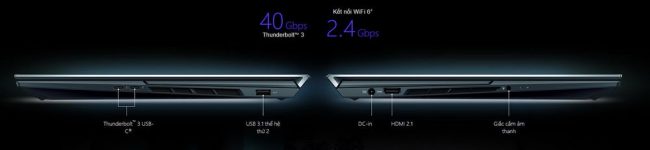| Kết nối | 2 x Thunderbolt 4 USB-C (lên tới 40 Gbps) 1 x USB 3.1 Gen 2 Type-A (lên tới 10 Gbps) 1 x HDMI 2.1 1 x Audio combo jack 1 x DC-in | |