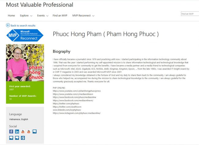 Trên đó ghi rõ, A Phủ đã được Microsoft Toàn cầu trao tặng giải thưởng MVP (một dạng hiệp sĩ CNTT) trong suốt 10 năm liên tiếp, từ 2007 tới 2016 (mỗi năm đều phải được xét duyệt lại). Tới năm 2017 thì A Phủ “nghỉ hưu”, trở thành thành viên của CLB MVP “nghỉ hưu” toàn cầu Microsoft Most Valuable Professional Reconnect. Có nghĩa là “nghỉ hưu” nhưng vẫn tiếp tục sứ mạng phục vụ cộng đồng với tinh thần Microsoft MVP.
