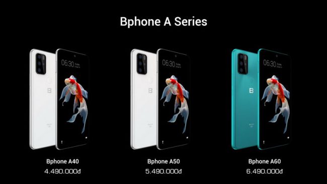 Mở đầu cho dòng smartphone Bphone A series là bộ ba Bphone A40, A50, A60 (chỉ khác nhau về dung lượng bộ nhớ). Tất cả đều có màn hình 6.67 inch Full HD+ (1080 x 2160 pixel), chạy chip xử lý MediaTek Helio G85, hỗ trợ thẻ nhớ tới 256GB, được thiết kế đẹp, thời trang, sang trọng với ngôn ngữ thiết kế không bị cũ hay lỗi mốt theo thời gian. Bộ ba Bphone A40, A50, A60 có bộ 4 camera sau AI, camera trước 8MP; mạng 4G LTE; kết nối không dây Wi-Fi 802.11ac, Bluetooth 5.0; pin 5.000mAh, sạc nhanh 18W; kích thước 75,8 x 150,6 x 7,6 mm; trọng lượng 203g. Bphone A40 và A50 có màu Trắng, Bphone A60 màu Xanh.