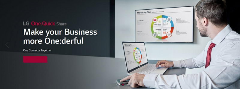 Bộ truyền hình ảnh không dây One:Quick Share chính là lời giải thông minh của LG cho vấn đề này. Thiết bị có dạng một bộ cắm (dongle Wi-Fi) với giao tiếp USB, kết nối và tương thích với hầu hết PC, máy tính bảng cùng nhiều thiết bị thông minh. Chỉ cần cắm One:Quick Share trên thiết bị cá nhân, hình ảnh từ đó sẽ được truyền tải tới màn hình LG tương thích.