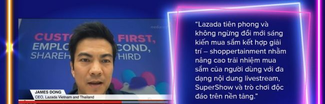 Ông James Dong, Tổng Giám đốc Lazada Việt Nam và Thái Lan, chia sẻ: “Lazada tiên phong và không ngừng đổi mới sáng kiến mua sắm kết hợp giải trí – shoppertainment nhằm nâng cao trải nhiệm mua sắm của người dùng với đa dạng nội dung livestream, SuperShow và trò chơi độc đáo trên nền tảng.”Trong buổi phỏng vấn với kênh truyền hình quốc tế CNA, ông James Dong đã có những chia sẻ về bức tranh tổng thể và tiềm lực phát triển của nền thương mại điện tử (TMĐT) Việt Nam, sự trỗi dậy mạnh mẽ của Lazada trong năm qua và chiến lược chinh phục khách hàng bằng hệ sinh thái TMĐT bền vững phục vụ người tiêu dùng, thương hiệu và nhà bán hàng. Theo đó, Lazada tích cực đầu tư và đổi mới sáng kiến mua sắm kết hợp giải trí – shoppertainment, giúp Lazada trở thành điểm đến toàn diện, nơi mà người dùng có thể xem livestream, giao lưu với người nổi tiếng, chơi trò chơi, săn ưu đãi và mua sắm cùng lúc.