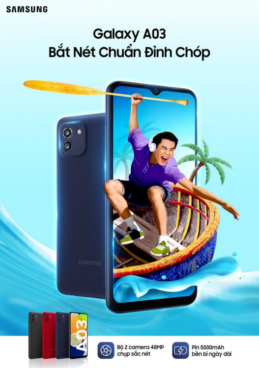 Smartphone đầu tiên của Samsung Electronics (Hàn Quốc) ra mắt thị trường Việt Nam trong năm 2022 là Samsung Galaxy A03. Thành viên mới nhất của dòng Galaxy A series này có bộ đôi camera 48MP sắc nét hàng đầu trong phân khúc smartphone dưới 4 triệu đồng được thiết kế cho giới trẻ GenZ thích chụp ảnh.