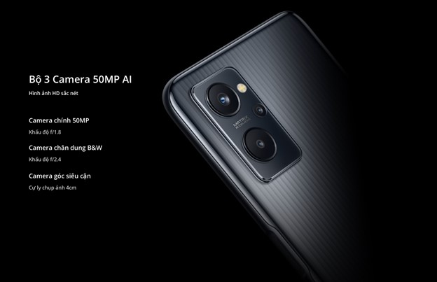 realme 9i có sự phối hợp tối ưu giữa cụm 3 camera. Trong đó, camera chính độ phân giải lên đến 50MP với khẩu độ f/1.8, có khả năng chụp ảnh tốt khi thiếu sáng hay cảnh đêm. Camera B&W 2MP f/2.4 để chụp chân dung và camera macro 2MP f/2.4 chụp cận cảnh.