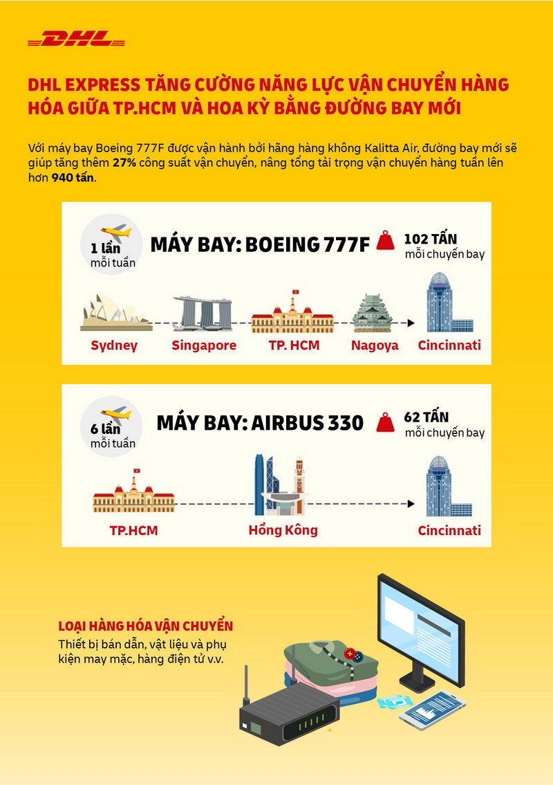 Đường bay này sẽ kết nối Sydney (Úc), Singapore, TP.HCM và Nagoya (Nhật Bản) trước khi về đến trung tâm DHL Express Cincinnati ở Hoa Kỳ. Máy bay Boeing 777F cũng sẽ giúp tăng thêm 27% công suất vận chuyển, nâng tổng tải trọng vận chuyển hàng tuần lên hơn 940 tấn.