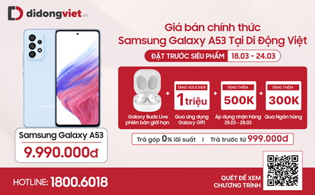 Samsung tối 17-3-2022 đã ra mắt smartphone tầm trung Samsung Galaxy A53 5G tại thị trường Việt Nam, thay thế cho thế hệ tiền nhiệm A52. Sản phẩm có giá bán chính thức từ 9,99 triệu đồng cho phiên bản RAM 8GB + ROM 128GB. Khách hàng đăng ký đặt trước được tặng thêm bộ quà trị giá đến 3,8 triệu đồng, hỗ trợ trade-in thu cũ đổi mới và trả góp 0% lãi suất.