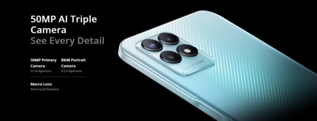 Cụm camera của narzo 50 được trang bị cụm ba camera sau với camera chính lên tới 50MP và hỗ trợ zoom kỹ thuật số 4X Max.