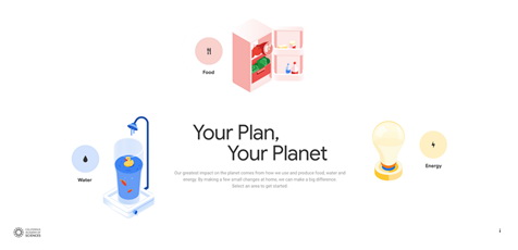 Bạn có biết chỉ bằng cách tắm ít hơn 3 phút mỗi ngày, bạn có thể tiết kiệm hơn 40 bồn nước trong một năm? Bạn có thể tham khảo các cách khác nhau để hiểu rõ hơn về tác động môi trường của mình và giảm lãng phí thực phẩm, lượng nước và năng lượng sử dụng thông qua công cụ tương tác “Kế hoạch của bạn, Hành tinh của bạn” (Your Plan, Your Planet). Công cụ này thậm chí còn đồng bộ hóa với Lịch Google (Google Calendar) để đặt lời nhắc về cam kết thay đổi thói quen của bạn (thí dụ: giảm thiểu thời gian tắm hoặc sử dụng những gì còn lại trong tủ lạnh).
