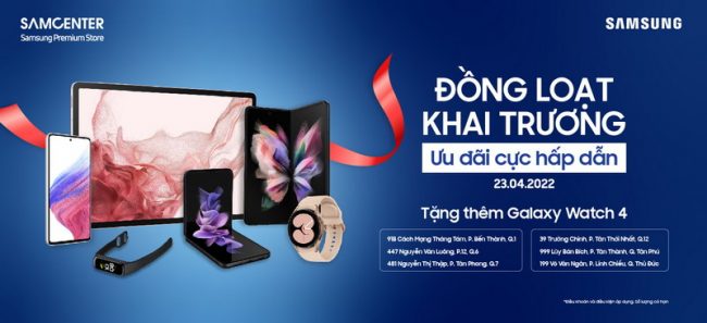 - Trong tuần lễ khai trương, khách hàng có cơ hội được tặng đồng hồ thông minh Watch Classic 42mm khi mua các dòng sản phẩm S22, Z Fold 3, Z Flip 3, Tab S8.