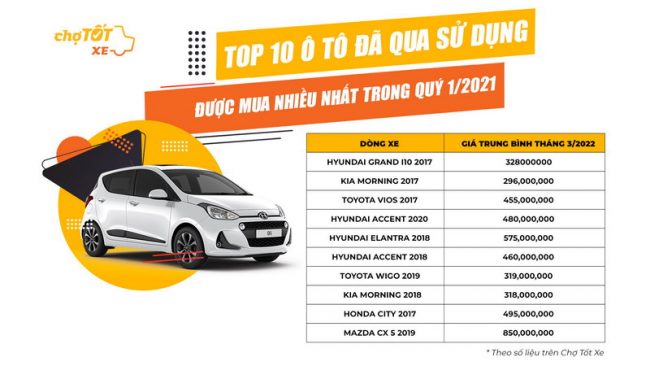 Ghi nhận trên Chợ Tốt Xe, những mẫu xe có giá dưới 500 triệu đồng được tìm mua nhiều nhất. 9/10 mẫu xe yêu thích nhất của tháng đều là những mẫu xe 4 chỗ có giá dưới 500 triệu đồng, nổi bật nhất vẫn là những mẫu xe “quốc dân” ở phân khúc hạng A, B như Hyundai Grand i10, Kia Morning, Toyota Vios, Hyundai Accent.