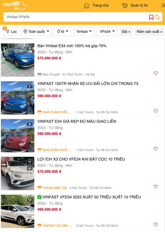 Mảng xe điện của VinFast cũng được mua bán sôi nổi không kém. Tính đến hết quý 1-2022, VinFast đã bàn giao 505 xe điện VFe34 đến tay khách hàng. Trên trang Chợ Tốt Xe, nhiều người săn tìm những chiếc xe điện siêu lướt từ chủ cũ để trải nghiệm hoặc liên hệ tin đăng bán của các showroom VinFast để đặt hàng. Số lượng liên hệ tìm mua trên những tin đăng VinFast VFe34 cao gấp 3 lần những mẫu xe khác.