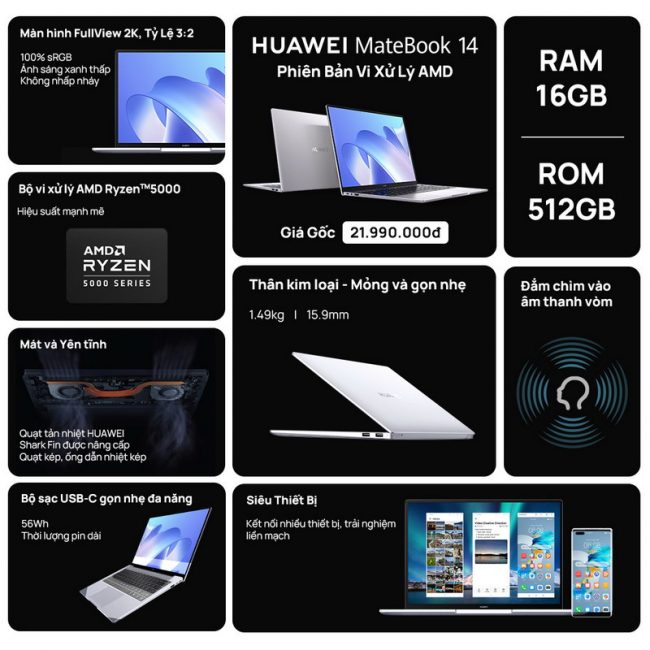 Nhóm Kinh doanh Tiêu dùng Huawei Việt Nam ngày 27-4-2022 đã giới thiệu thêm phiên bản vi xử lý AMD Ryzen 5000 series của máy tính xách tay cao cấp HUAWEI MateBook 14 series 2021. Trước đó, hồi thượng tuần tháng 2-2022, Huawei đã ra mắt người dùng ở Việt Nam phiên bản HUAWEI MateBook 14 chạy bộ xử lý Intel Core i5-1135G7 thế hệ 11.