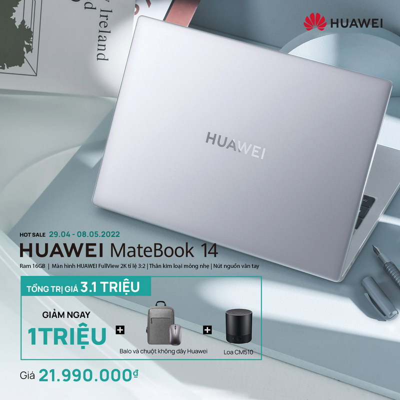 HUAWEI MateBook 14 mới chạy CPU AMD Ryzen 50000 series có giá 21.990.000 đồng, lên kệ vào ngày 28-4-2022 tại chuỗi cửa hàng trải nghiệm Huawei, CellphoneS, Hoàng Hà Mobile, Siêu Tốc, Shopee, Lazada, Tiki. Từ ngày 28-4 đến 8-5-2022, HUAWEI tiến hành chương trình ưu đãi đặc biệt lên đển 3,1 triệu đồng cho sản phẩm MateBook 14 mới bao gồm voucher giảm giá 1 triệu đồng, balo Huawei, chuột không dây Huawei, loa CM510.