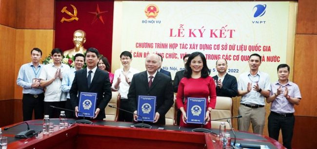 Ngày 10-5-2022 tại Hà Nội, Bộ Nội vụ và Tập đoàn Bưu chính – Viễn thông Việt Nam (VNPT) đã ký kết chương trình hợp tác xây dựng Cơ sở Dữ liệu Quốc gia về cán bộ, công chức, viên chức trong các cơ quan Nhà nước. Theo các nội dung ký kết, Tập đoàn VNPT sẽ là đơn vị đồng hành cùng Bộ Nội vụ trong việc triển khai thực hiện nhiệm vụ quan trọng này.