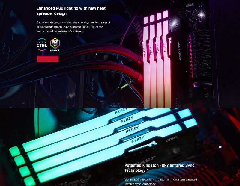 Kingston FURY, một thương hiệu của Kingston Technology (Mỹ), hồi trung tuần tháng 6-2022 đã ra mắt bộ nhớ Kingston FURY Beast DDR5 RGB. Theo giới thiệu, đây là mô-đun DDR5 đầu tiên của Kingston FURY Beast vượt qua tốc độ 10.000MT/giây, được trang bị hiệu ứng ánh sáng RGB tăng cường cùng thiết kế tản nhiệt mới mang đến trải nghiệm chiếu sáng mượt mà và rực rỡ.