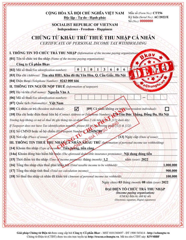 Mẫu Chứng từ khấu trừ thuế TNCN điện tử.