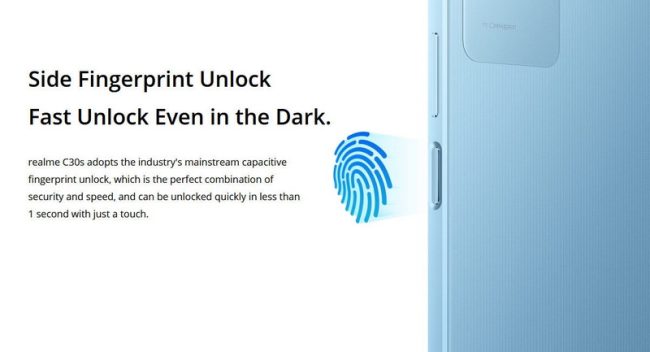Sau khi ra mắt toàn cầu ngày 14-9-2022, chiếc smartphone realme C30s với tính năng mở khóa bằng vân tay cạnh viền (side-mounted fingerprint) sẽ sớm được ra mắt trên thị trường Việt Nam. Theo realme Việt Nam, đây là chiếc smartphone đầu tiên trong phân khúc giá phổ thông được trang bị tính năng mở khóa vân tay cạnh viền.