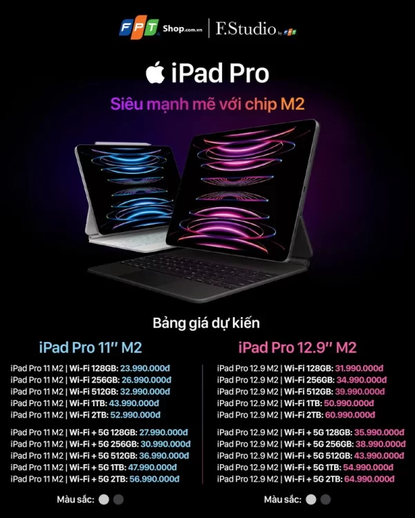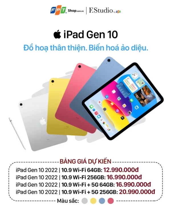 Hai dòng tablet mới của Apple là iPad Gen 10 (chip A14 Bionic) và iPad Pro (chip M2) đã được trình làng ngày 18-10-2022. Dự đoán dòng máy tính bảng mới nhất của nhà “Táo Khuyết” sẽ chính thức được bán ra tại Việt Nam trong tháng 11-2022 với giá bán dự kiến tại hệ thống FPT Shop và F.Studio by FPT từ 12,99 triệu đồng (cho iPad Gen 10) và từ 23,99 triệu đồng (cho iPad Pro M2). Từ ngày 19-10-2022, hệ thống FPT Shop và F.Studio by FPT đã bắt đầu nhận đăng ký trước các dòng iPad 2022 trên website cửa hàng.