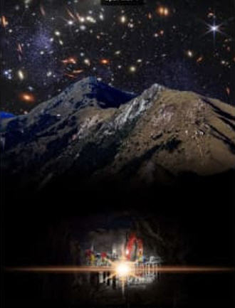 Bức ảnh chụp lại quá trình ngọn núi Cận Bình (Jinping Mountain) che chắn phòng thí nghiệm JUNA khỏi bức xạ vũ trụ. Superimposed là một quả cầu lửa cách điệu của một vụ va chạm hạt nhân. Bức ảnh Dải Ngân hà (Milky Way) với những ngôi sao cổ trên bầu trời đêm được chụp bởi Kính thiên văn Không gian James Webb (James Webb Space Telescope). (Nguồn hình ảnh: JianJun He)