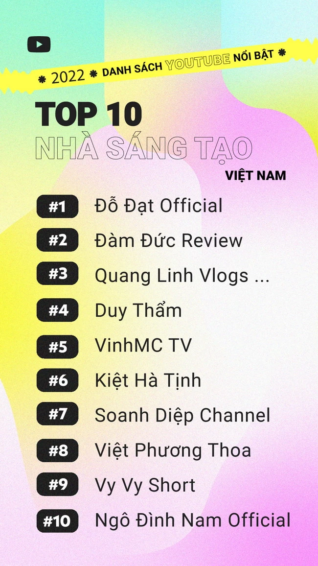 TOP 10 NHÀ SÁNG TẠO YOUTUBE NỔI BẬT NHẤT NĂM 2022