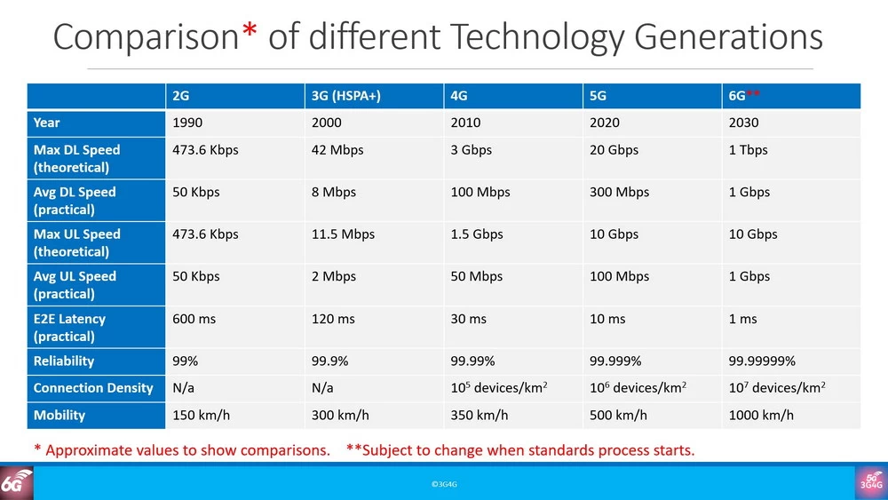 Mạng 6G sẽ có tốc độ kết nối không còn ở múc “gigabit/giây” (Gbps) mà tăng vọt tới “terabit/giây” (Tbps), tức nhanh gấp 1.000 lần. 6G sử dụng phổ tần số cực cao (Extreme High Frequency) mang lại tốc độ cực cao và dung lượng lớn trong khoảng cách ngắn. Mạng 6G sẽ phục vụ cho nhu cầu kết nối di động vào thời kỳ đó với độ phủ cực rộng và ứng dụng trí thông minh nhân tạo.