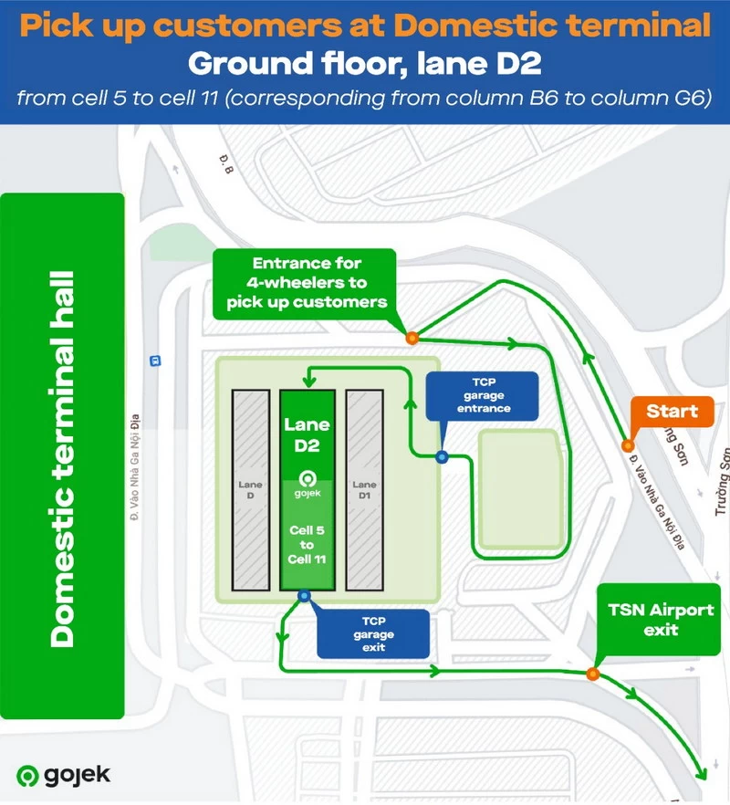 Việc Gojek khai thác hoạt động tại 7 vị trí của làn D2 tại ga quốc nội mang đến sự tiện lợi cho khách hàng lẫn đối tác tài xế. Để bắt xe GoCar, từ khu vực sảnh ga quốc nội, người dùng đi thẳng hướng về tòa nhà TCP, làn D2 để đón xe GoCar nằm ở tầng trệt từ ô thứ 5 đến ô thứ 11, tương ứng với từ cột B6 đến cột G6.