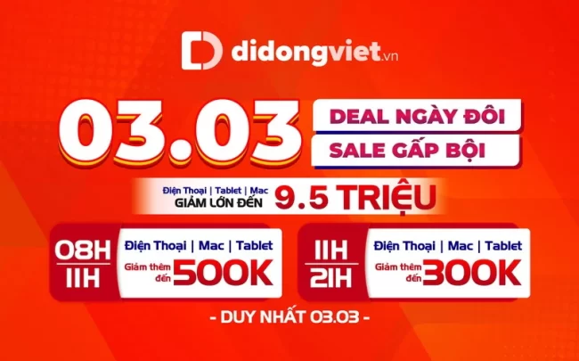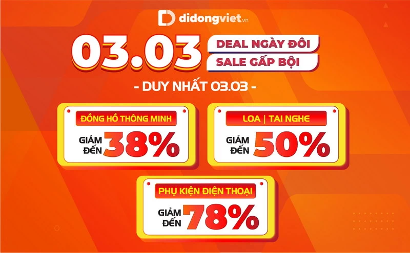 Ghi nhận tại Di Động Việt, duy nhất ngày 3-3-2023, hệ thống sẽ đem đến cho người dùng những ưu đãi siêu “hời”. Đây là đợt khuyến mại lớn định kỳ của hệ thống vào mỗi tháng, được rất nhiều người dùng mong đợi để tiết kiệm tối đa chi phí khi mua sắm. Cụ thể, khi mua điện thoại, tablet, MacBook, người dùng sẽ được giảm thêm đến 500 ngàn đồng trên mức giá đã được giảm sẵn đến 9,5 triệu đồng, nâng tổng mức giảm lên đến 10 triệu đồng; phụ kiện công nghệ giảm mạnh đến 78%.