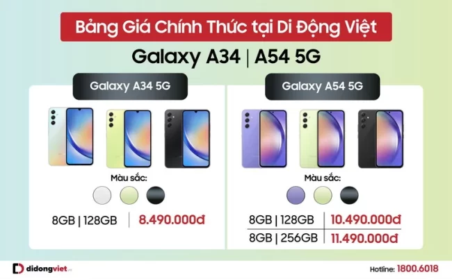 Bảng giá chính thức của Galaxy A34 và A54 5G tại Di Động Việt.