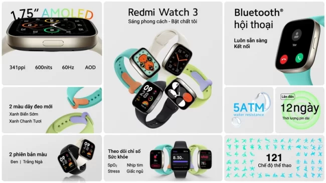 Sở hữu màn hình màu AMOLED 1.75 inch cùng nhiều tính năng tiện lợi như hỗ trợ gọi thoại qua Bluetooth, khả năng định vị chính xác tới từng bước chân thông qua hệ thống GPS đa băng tần được tích hợp sẵn cùng khả năng kháng nước 5ATM, Redmi Watch 3 mang đến cho người dùng những trải nghiệm sử dụng hàng ngày hoặc khi tập luyện tuyệt vời với giá chưa tới 3 triệu đồng.