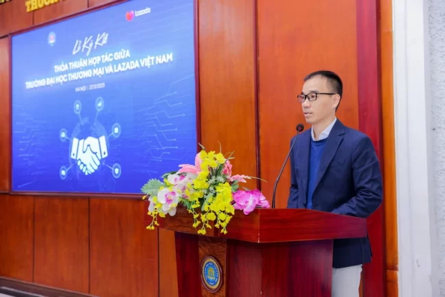 Ông Đặng Anh Dũng, Phó Tổng Giám đốc Lazada Việt Nam, tại Lễ ký kết thỏa thuận hợp tác với Trường Đại học Thương mại ngày 27-3-2023.