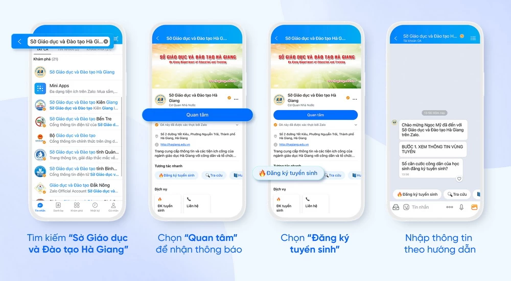 Phụ huynh và học sinh chỉ cần dùng điện thoại thông minh truy cập vào ứng dụng Zalo, tìm kiếm “Sở Giáo dục và Đào tạo Hà Giang”, nhấn “Quan tâm” để nhận được thông tin từ Hội đồng tuyển sinh, và thực hiện các bước theo hướng dẫn.